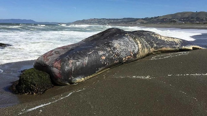 A este enorme cachalote, varado en la costa de California, le fue encontrado en el estómago mucho plástico.
