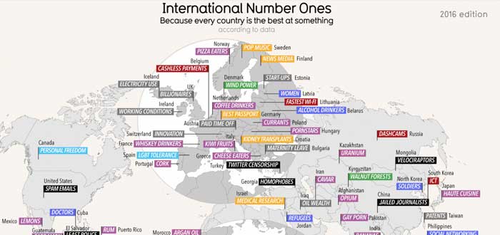 La primera edición del mapa «en qué es mejor cada país» data de 2010, con la última actualización en 2016. La mayoría de las naciones han cambiado sus «fachadas» en lo que se destacaban (por suerte, para lo mejor), a la vez fueron añadidos países, que en la primera edición no salían.