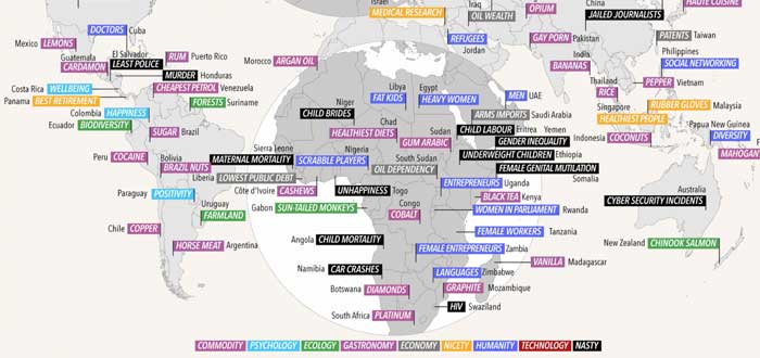 Este periodista y diseñador británico, luego de una extensa investigación, ha elaborado un mapa en el que ha determinado, en qué se destaca cada una de las naciones del mundo. No podemos negar que cada país puede presumir de algo. Bueno, ¿en qué lo es el tuyo? ¡Para ello, observa el Mapa! Hay que aclarar que McCandless ha sido muy crítico, y en algunos casos, el término «mejor» no puede ser tomado como algo absolutamente positivo.