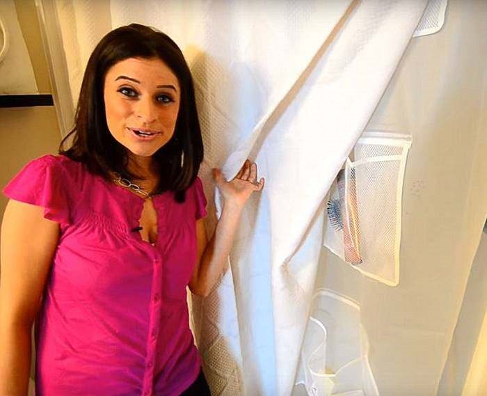El jabón y el cepillo se ocultan aquí, justo detrás de la cortina de la ducha. Para ello, Alejandra cosió unos bolsillos especiales.