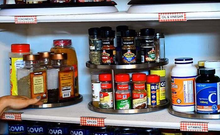 Solo mira la despensa de la cocina… Estas filas de frascos inmaculados son la delicia de cualquier perfeccionista: Especias, vitaminas y condimentos se colocan en la plataforma giratoria, junto a las placas que están fijas.