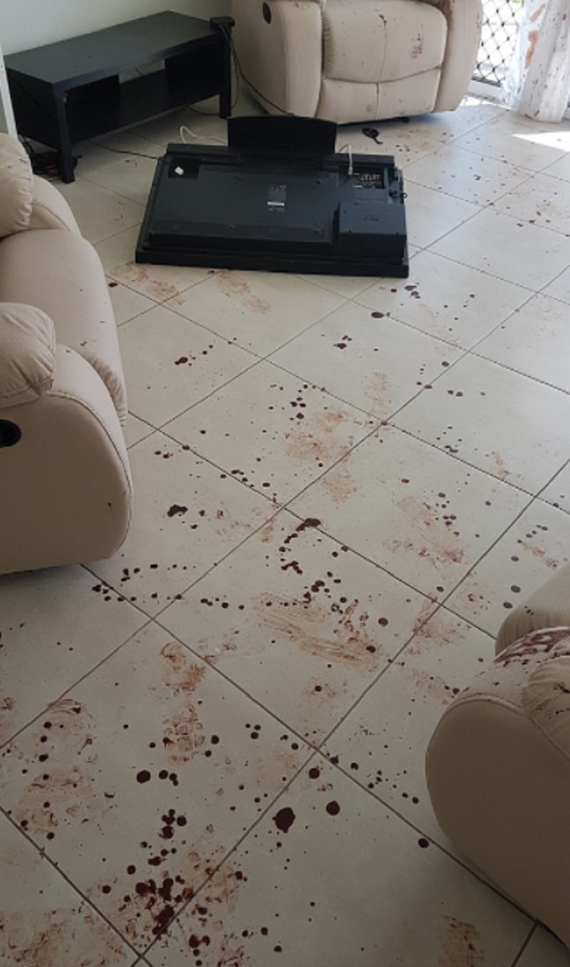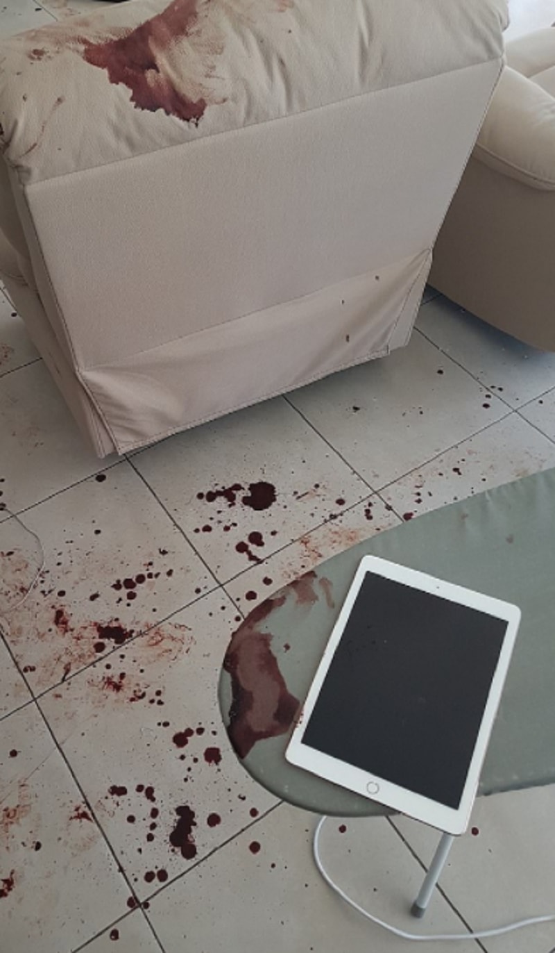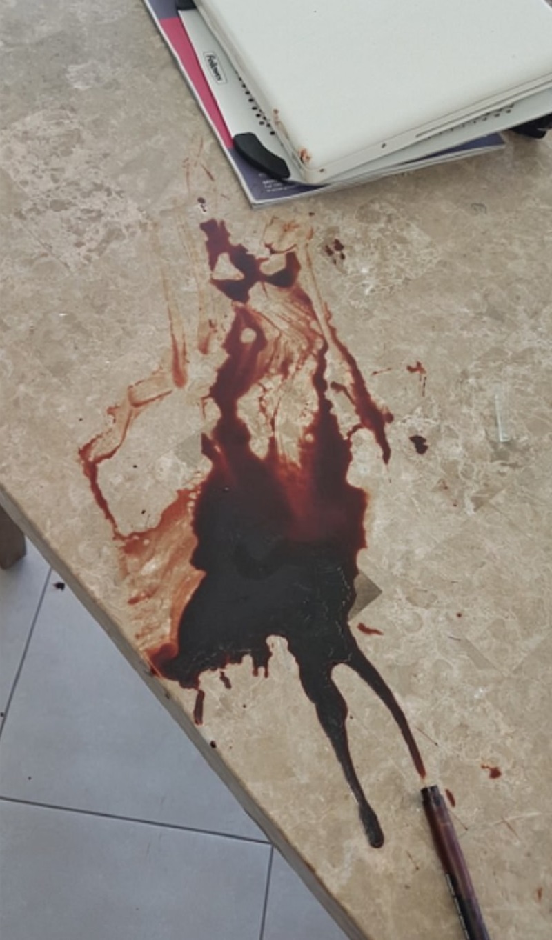 - Restos de sangre, producto de un golpe contra una mesa de vidrio.