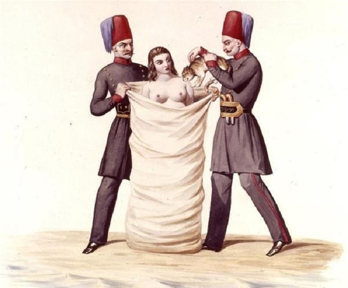 Cuando se daban cuenta del adulterio, la mujer era tratada duramente: la ponían en la bolsa junto con un gato, y luego golpeaban con las cadenas, tratando de dar al animal. Hasta la muerte…