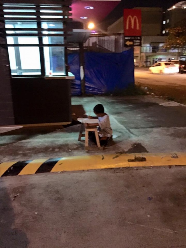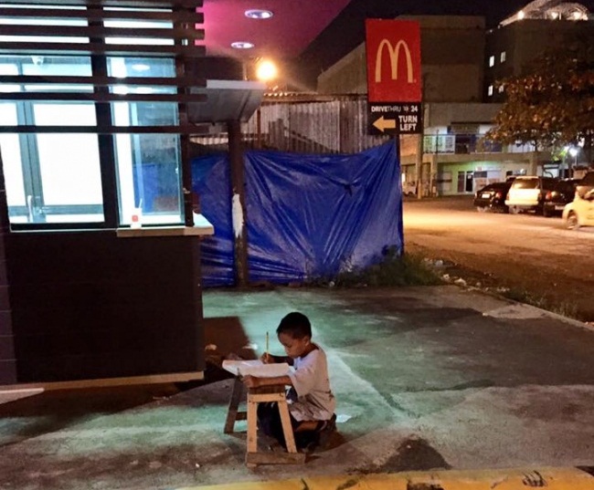Todo cambió en una noche, cuando la estudiante Joyce Gilos Torrefranca, que se encontraba en la ciudad filipina de Mandaue, vio a este niño, en plena calle, haciendo sus deberes, a la luz de los ventanales de un establecimiento «McDonalds». El chico estaba sentado en la acera, sobre un taburete, mientras escribía en su cuaderno. Joyce, impresionada, fotografió a este diligente muchacho y publicó las fotos en su página de Facebook.