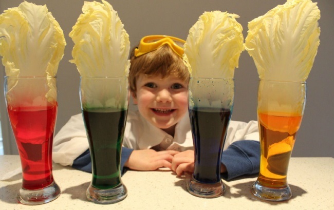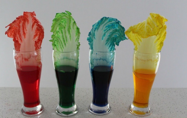 Agrega en cada recipiente con agua un poco de colorante de comida de diferente color. Luego introduce dentro del mismo una hoja de col o una flor blanca. Déjalas allí toda la noche. A la mañana siguiente verás como todas han cambiado de color.