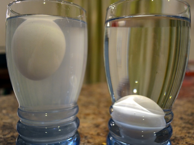 Llena el segundo vaso con agua tibia y agrégale 4-5 cucharaditas de sal. Es recomendable que esperes hasta que el agua se enfríe. Luego coloca el segundo huevo en el vaso, y ¡voila! el huevo flota en la superficie.