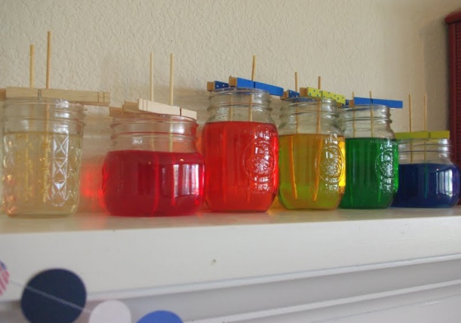 Después sírvelo por igual en todos los vasos transparentes, y agrégale un poco de colorante de comida a cada uno. Inserta los palitos que habías preparado el día anterior en los vasos con jarabe y colorante, evitando que estos toquen las paredes del recipiente. Para ello te puedes auxiliar de un gancho para ropa, por ejemplo.