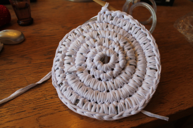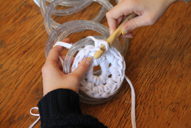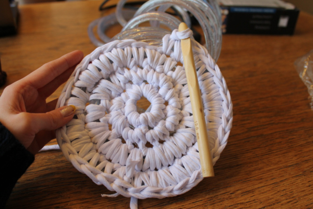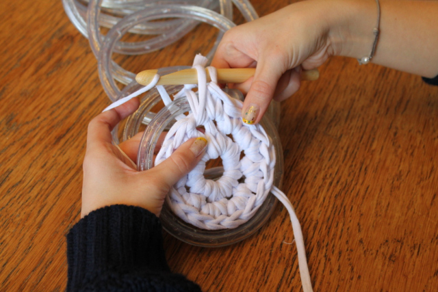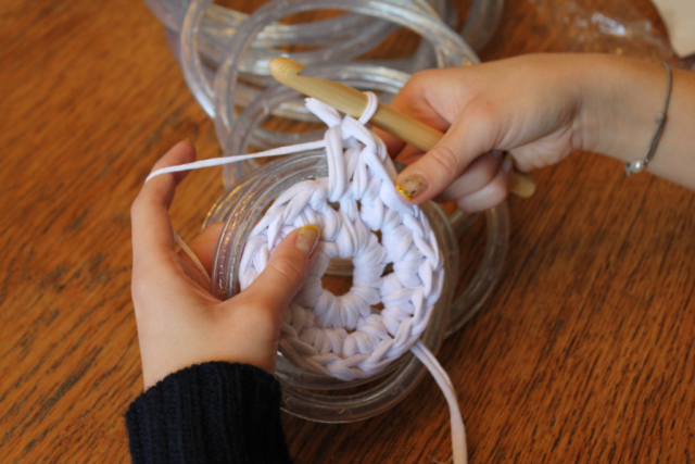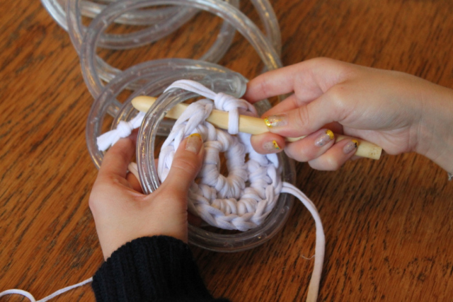 1. Comienza la labor de punto con 8 cadenetas sin nudos y conéctalas en un anillo. La siguiente fila va envuelta con cadenetas dobles sin anudar, formando un bucle. Ahora agrega el cable de luces al diseño.