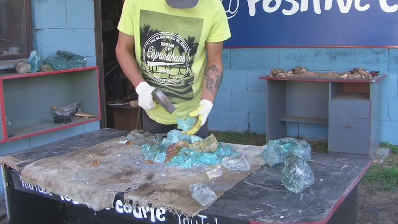 7. El punto culminante será pegar las brillantes piedras de cristal que llenarán el espacio en el centro de la imagen. Si tienes sólo piezas de vidrio de gran tamaño, no es problema alguno, pártelas cuidadosamente con un martillo. Usa el pegamento, para fijarlas a la imagen.