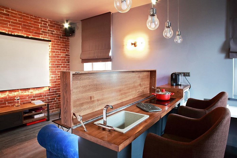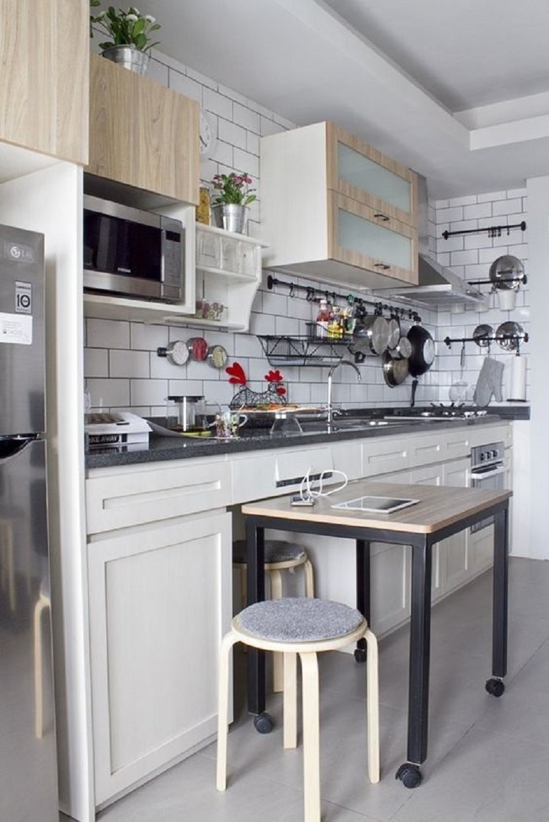 6. Si tienes un salón pequeño, esta opción es para ti. Combina el escritorio y la cocina, mediante una cubierta móvil. ¿Qué te parece?