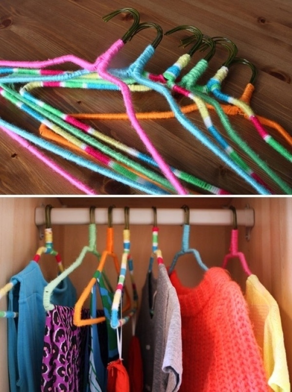 16. Enrollar hilos de color en la percha alegrará la vista. ¡Y la ropa ya no se caerá, ni se estirará!