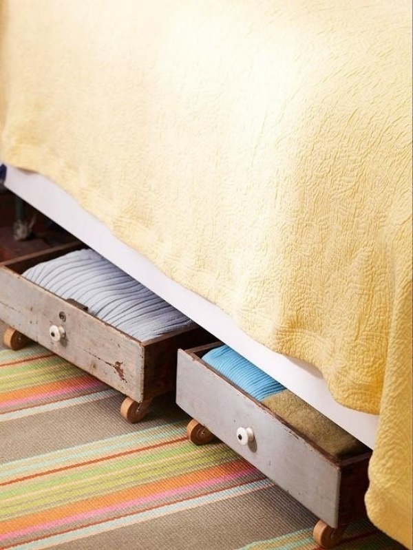 22. El espacio debajo de la cama puede ser funcional, si adjuntas ruedas a los cajones. Idea muy útil para pequeños apartamentos.