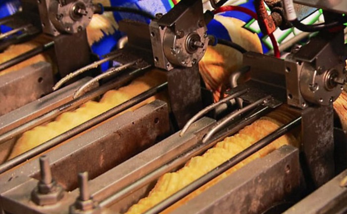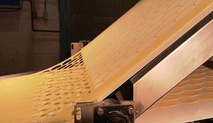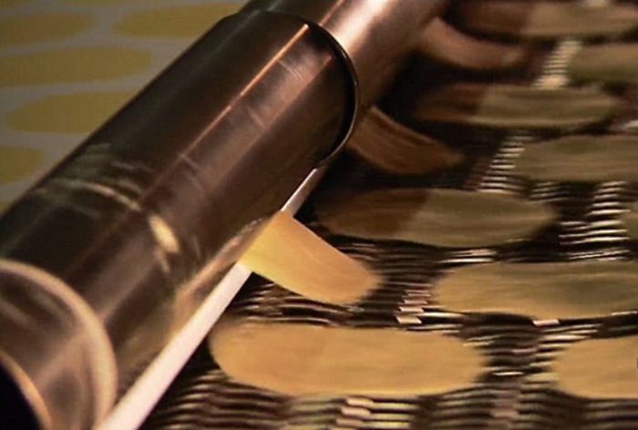 El siguiente rodillo, con moldes especiales acoplados, corta la masa en círculos. ¡Es por ello que todos los aperitivos en el paquete lucen exactamente iguales!