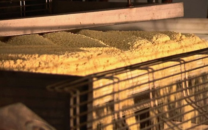 Toda la mezcla cae sobre una cinta transportadora, donde se mezcla y se tamiza repetidamente, a través de un enrejado especial, hasta formar un producto homogéneo.