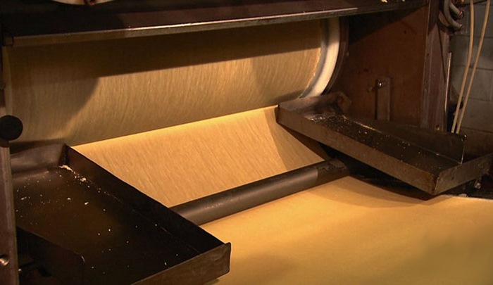 A partir de entonces, la masa pasa a una prensa. Un rodillo enorme la comprime, con una fuerza de 4 toneladas, hasta convertirla en una lámina de plástico.