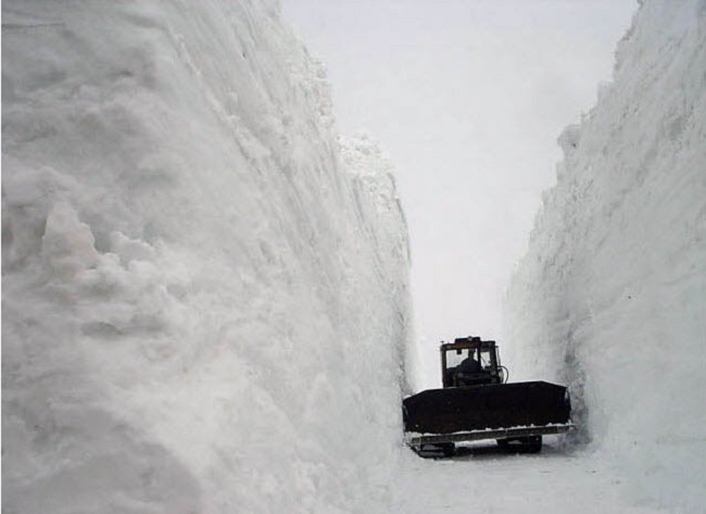 Este barre nieve gigante luce pequeño, en comparación con los bancos de nieve de los alrededores.