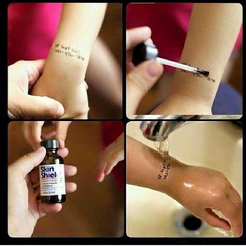 «Si vas a llevar a tu hijo a un gran evento público este verano, escribe tu número de teléfono en la muñeca de tu hijo, luego cúbrelo con un apósito líquido (tiritas en líquido) para evitar que se corra o se limpie. De esta manera, si el niño se pierde, y se acerca a alguien en busca de ayuda, podrá contactar rápidamente contigo»