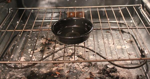 Coloque media tasa de amoníaco dentro del horno, completamente enfriado. Déjela ahí durante la noche y limpie el horno completamente en la mañana. ¡Ya está!