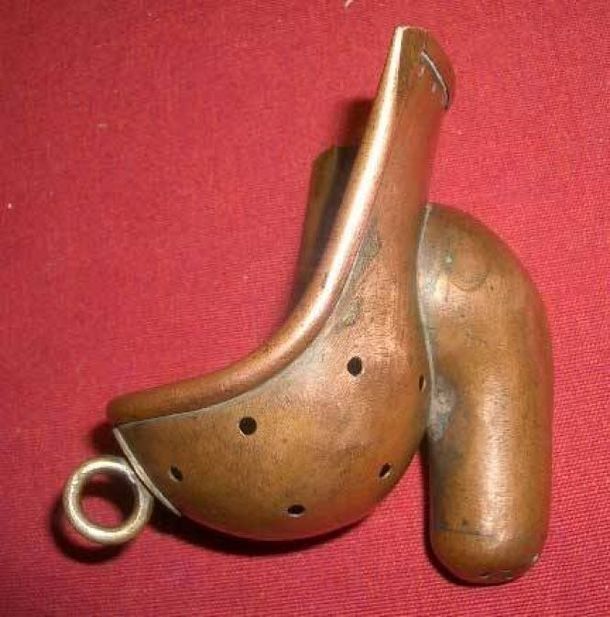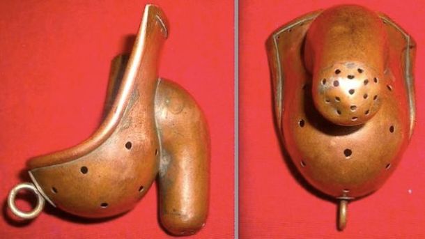 Este artefacto fue utilizado no hace mucho tiempo – unos 150 años atrás. Fue hecho especialmente para los niños, con el fin de evitar el pecado. Con un tamaño de tres pulgadas y media, hecho de cobre.