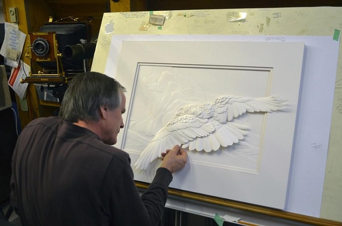 Sorprendentemente, el maestro utiliza exclusivamente papel blanco. Según él, la imagen adquiere el toque más realista.