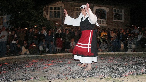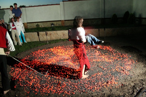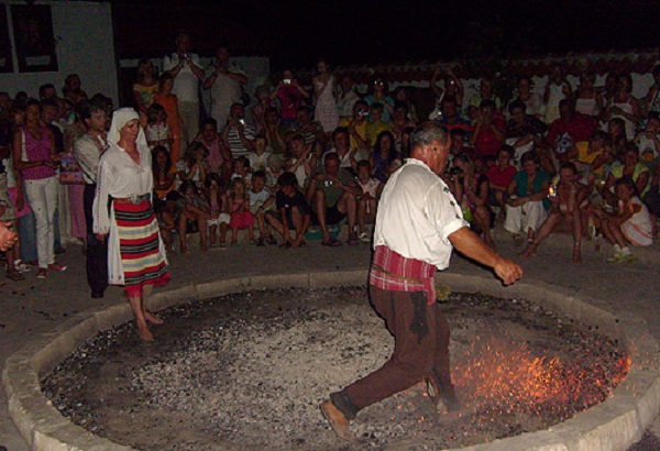 A última hora de la tarde, cuando el sol veraniego ya estaba completamente oculto tras el horizonte, todos los participantes pudimos disfrutar de la «danza caliente sobre las brasas», por personas especialmente entrenadas para ello. Este fenómeno en Bulgaria se conoce como Nestinarstvo, y a la gente que baila sobre las brasas, nestinari.