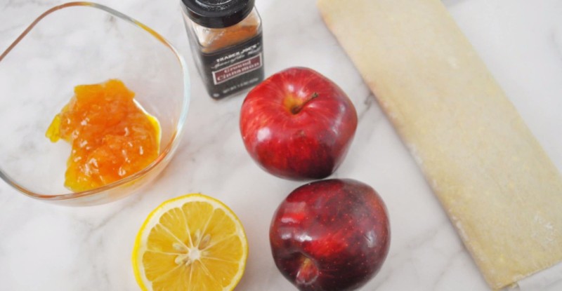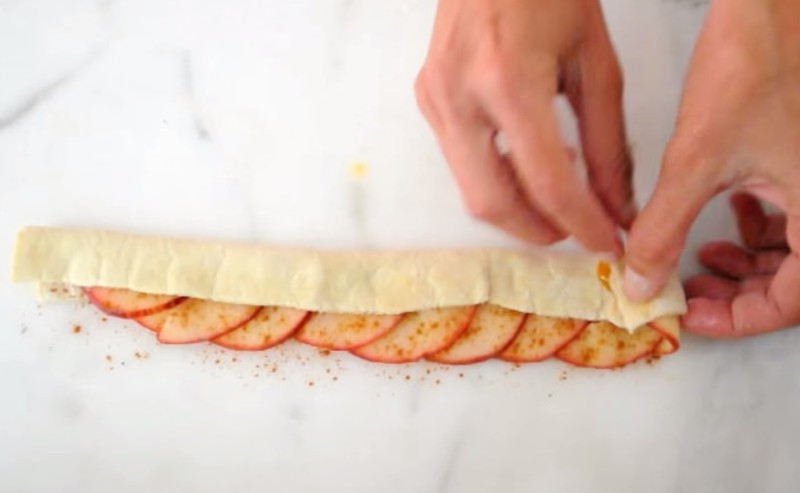 Unta las tiras con mermelada de albaricoque y coloca las rebanadas de manzana encima. Se puede añadir un poco de canela a gusto. Levanta la parte inferior de la masa hasta que se unan los pétalos-manzanas, a continuación, envuelve la tira resultante en un rollo.