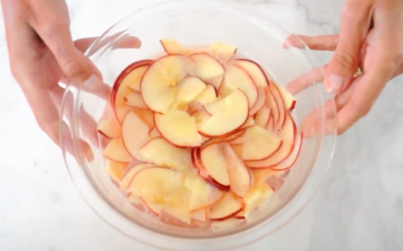 Llena un pequeño recipiente con agua hasta la mitad, añadiéndole el jugo de limón. Paso seguido, agrégale las manzanas al recipiente y colócalo en el horno microondas por 3 minutos.