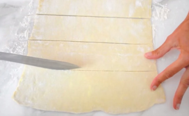 Ahora el turno de la masa para bizcochos: aplánala y córtala en 6 tiras finas.