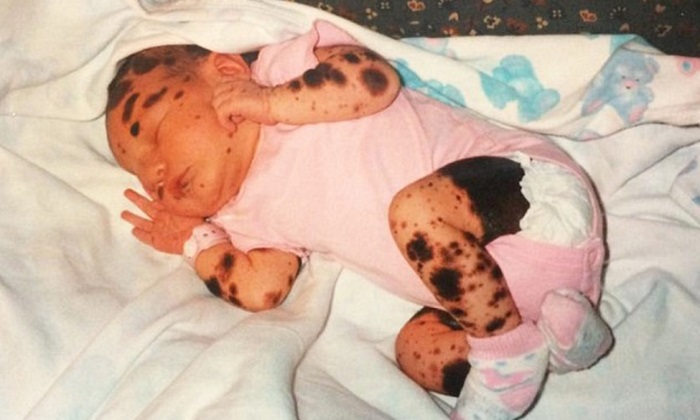 Sierra nació con una rara condición de la piel. Alrededor de 2/3 de su cuerpo está cubierto de marcas de nacimiento. Los médicos la diagnosticaron como un «nevo melanocítico congénito». Esto ocurre una vez cada 500 000 casos.