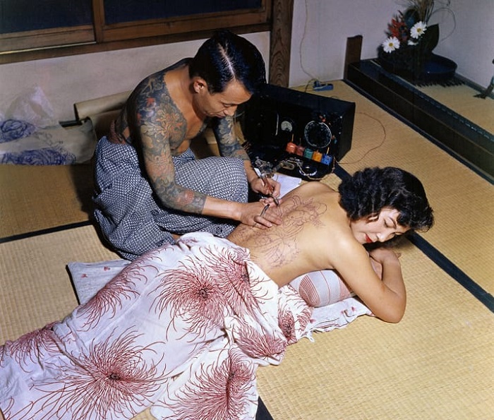 Un artista japonés pinta un patrón en la espalda de su cliente, los años 50.