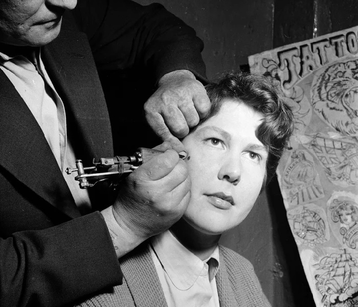 El tatuador cubre una marca de nacimiento en la cara de una chica, 1956.