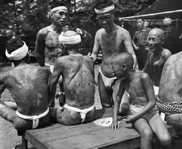 Niño admira los tatuajes en el cuerpo de los hombres japoneses, 1958.