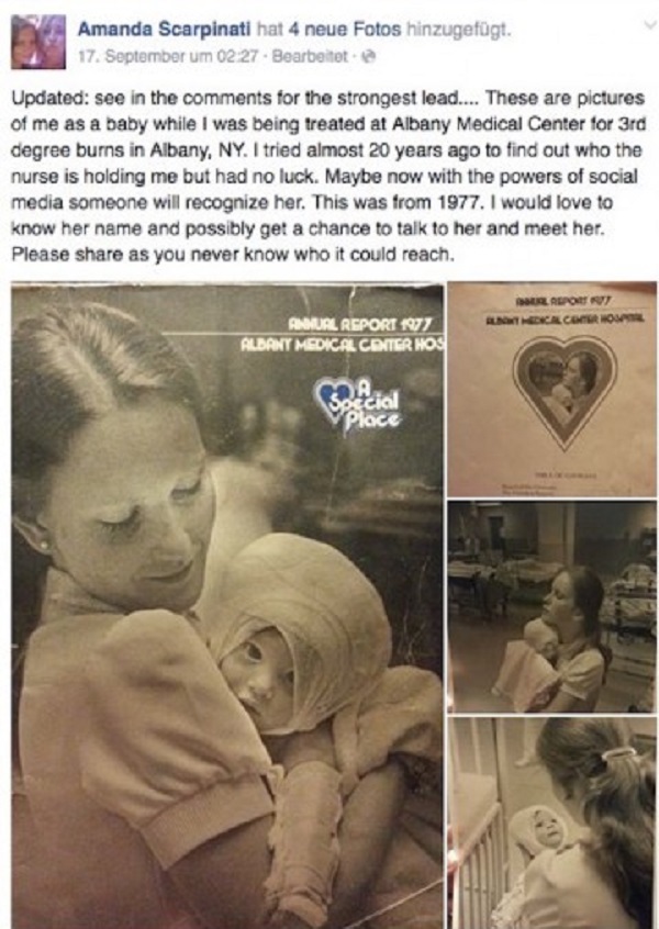 Cuando Amanda cumplió 38 años, las tecnologías modernas empezaban a entrar a nuestras vidas, brindándonos la posibilidad única, absolutamente increíble hasta entonces, de encontrar los lazos de amistades y personas perdidas en el transcurso de nuestras vidas. Amanda, sin dudarlo ni un instante, decidió emprender la búsqueda de aquella joven enfermera de las fotos, su salvadora… Para hallar a esta mujer, se sirvió de su página en Facebook, colocando en ella viejas fotos en blanco y negro. Amanda se apoyó en sus amigos, para acelerar la búsqueda y divulgar en las noticias sus intenciones de encontrar a la joven. Describiendo brevemente la historia de estas fotografías, apeló al público para que le respondieran, si alguien sabía algo acerca de aquella amorosa enfermera.