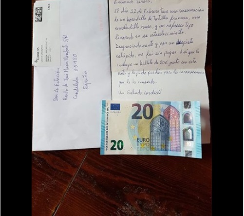 En la carta, el cliente afirmaba que se fue sin pagar, debido a «un despiste estúpido». Así que, para reparar las pérdidas, envió al establecimiento un billete de 20 euros. «Le pido perdón por la inconveniencia que le he causado», – concluye la nota. Ana Isabel Sánchez, la gerente del bar, cuenta: «La carta llegó cuando yo estaba de viaje, y no la vi hasta el fin de semana. Cuando llegué, mi marido me dijo, «mira lo que nos ha llegado, vas a alucinar». Y mira que aluciné…»