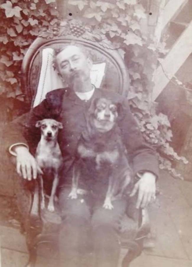 Muy a menudo, las personas eran fotografiadas con algunas de sus mascotas u objetos favoritos, como este hombre con sus perros en el sillón.
