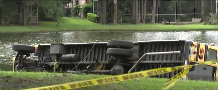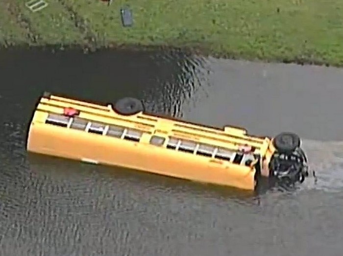 La noticia sobre este increíble accidente, que se produjo en el estado norteamericano de Florida, sobrevoló el mundo en cuestión de horas. A un autobús escolar, con 27 niños dentro, le fallaron los frenos. Los mejores esfuerzos del conductor no dieron frutos: el vehículo se salió de la carretera, totalmente fuera de control, chocó contra la barandilla y… ¡voló directamente al lago! Afortunadamente, ningún niño salió lastimado.