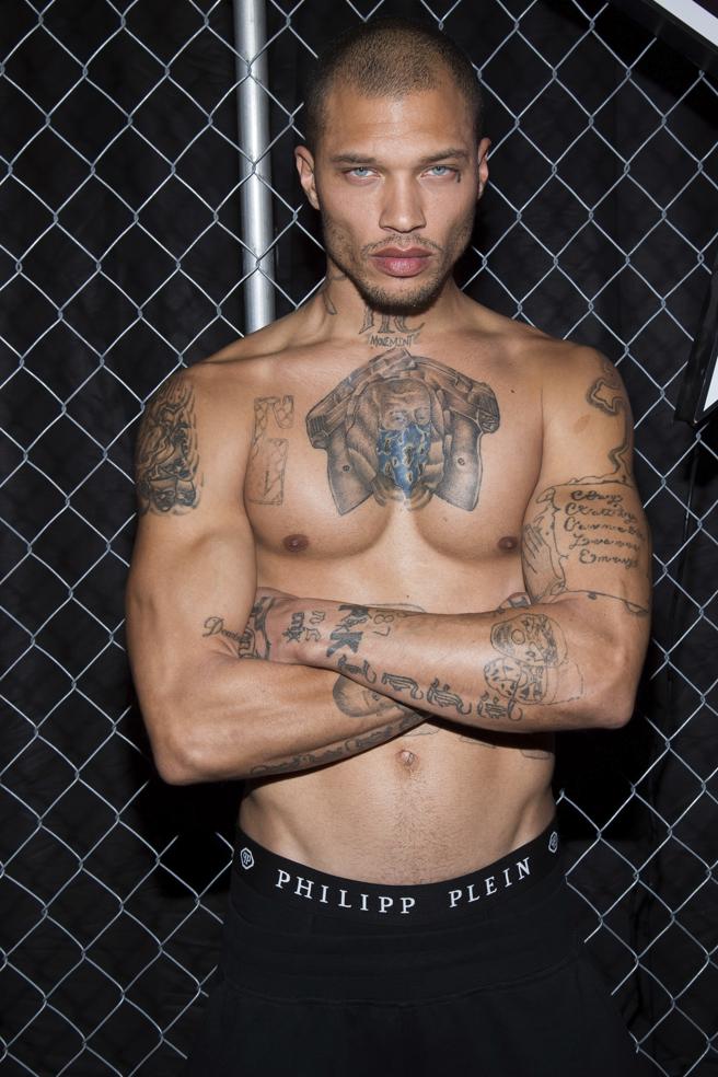 Meeks desfiló por la pasarela, vestido completamente de negro, con uno de los abrigos estrella de la colección otoño-invierno 2017 de Philipp Plein. También se han divulgado algunas fotografías del modelo, tomadas justo antes del inicio del desfile, en las que muestra todos los tatuajes que cubren su torso.