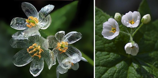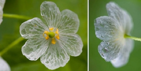 Al entrar en contacto con el agua de la lluvia, los pétalos de la flor poco a poco comienzan a perder su tonalidad blanca, volviéndose totalmente transparentes. Al secarse totalmente, los pétalos de esta sorprendente flor retoman su tonalidad blanca.