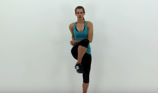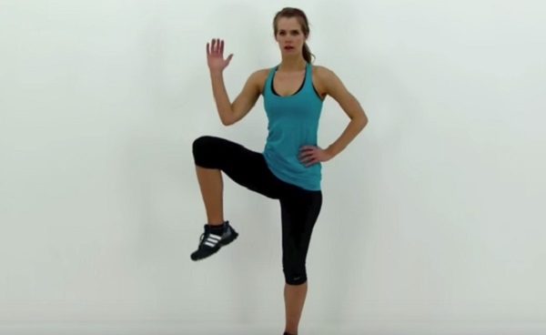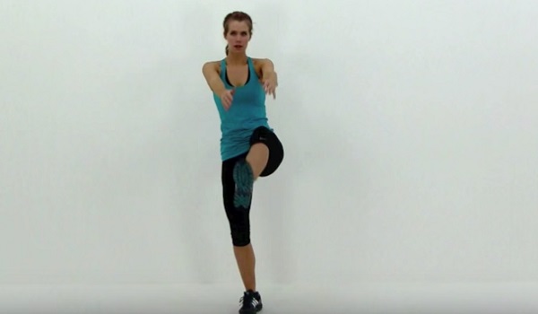 Los músculos abdominales laterales generalmente quedán poco involucrados en el entrenamiento. Pero precisamente gracias a su fuerza, la cintura tiene un aspecto delgado. Levanta una pierna, dobla la rodilla hasta la cintura y estira la punta del pie hacia afuera. Con la mano opuesta, sujetada a la cintura, levanta el brazo y la pierna del mismo lado, al mismo tiempo. La otra parte del cuerpo, trata de mantenerla recta.