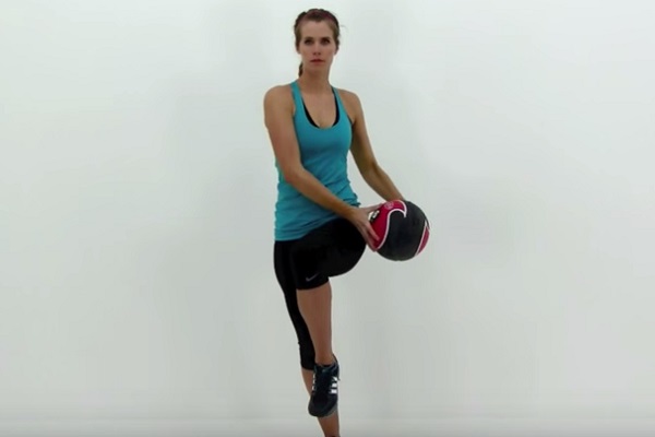 Para este ejercicio, se requiere de un objeto de peso aumentado. Se puede utilizar una pelota, mancuerna, botella de agua o, incluso, ¡una sandía no muy grande! Levanta la pierna, quédate recto en esta posición y mueve el peso en diagonal. Para mantener el balance, tendrás que contraer muy bien los músculos abdominales más bajos y los oblicuos. Alterna la pierna y repite.