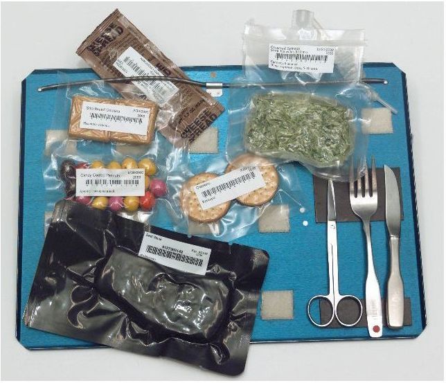 Bandeja, que utilizan los cosmonautas, equipada con varias mordazas e imanes, para que los alimentos y los cubiertos no se dispersen en condiciones de ingravidez.