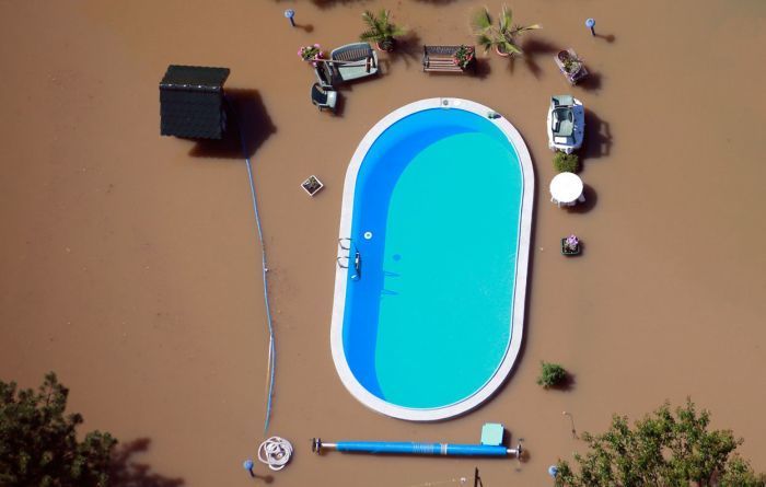 Piscina con agua cristalina, en medio de un área completamente inundada.
