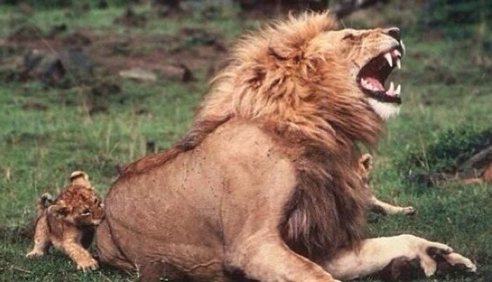 Este león adulto le sigue el juego al cachorro, aparentando el enorme sufrimiento por la mordedura.