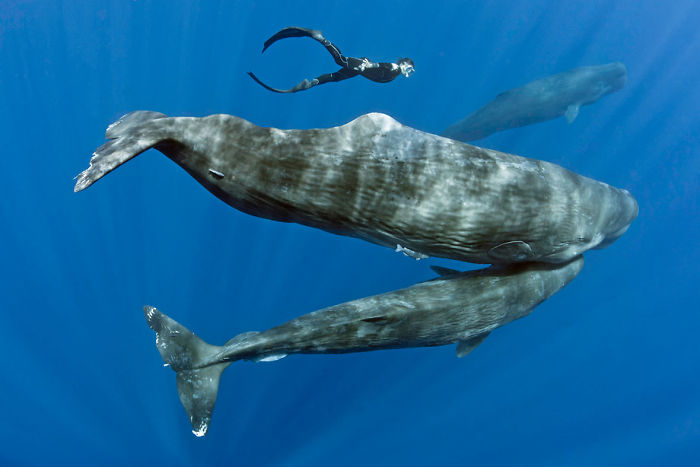 Los cachalotes, que parecen lentos y torpes, se ven muy armoniosos en el medio del ambiente oceánico.
