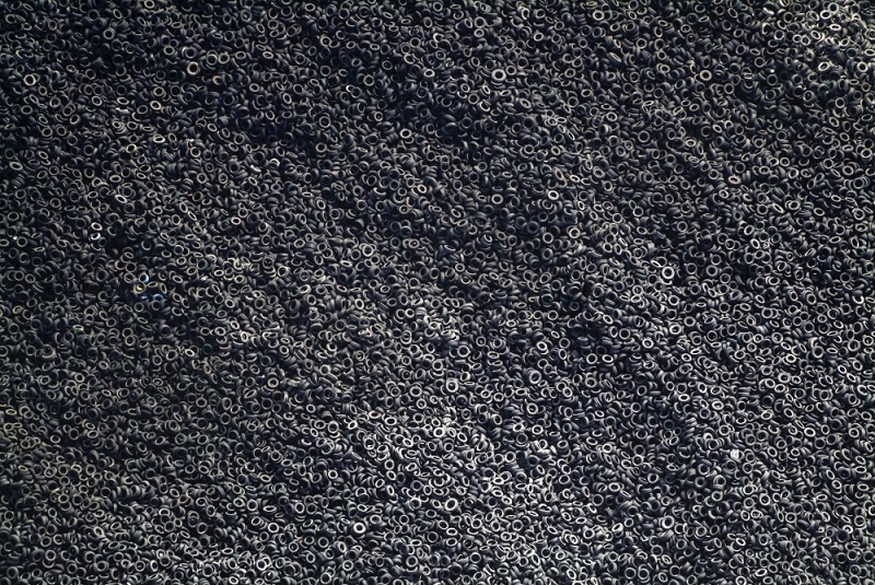 - Reciclaje de neumáticos usados, según una vista de pájaro.
