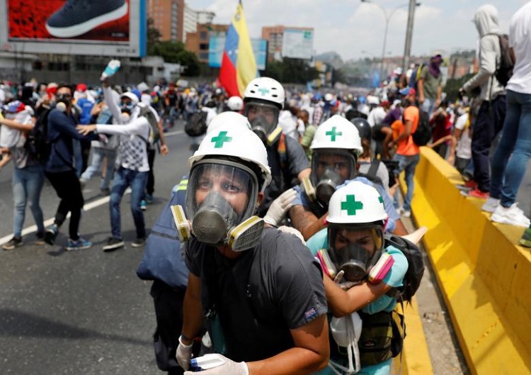 Un grupo de voluntarios durante los enfrentamientos entre manifestantes y policía en una protesta contra el presidente de Venezuela, Nicolás Manduro, en Caracas, 26 de Abril, 2017