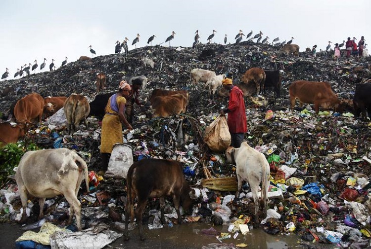 Durante el Día de la Tierra, estas personas reúnen materiales que pueden ser reciclados, en el vertedero en Guwahati, India, 22 de Abril, 2017