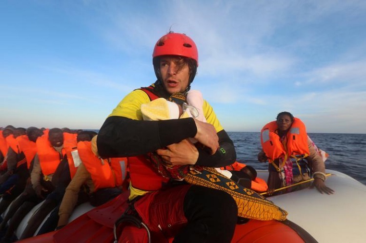 Este rescatador de la organización no gubernamental española sostiene a un niño, durante una operación de búsqueda y rescate en el mar Mediterráneo, 22 millas náuticas de la costa de la ciudad libia de Sabratha