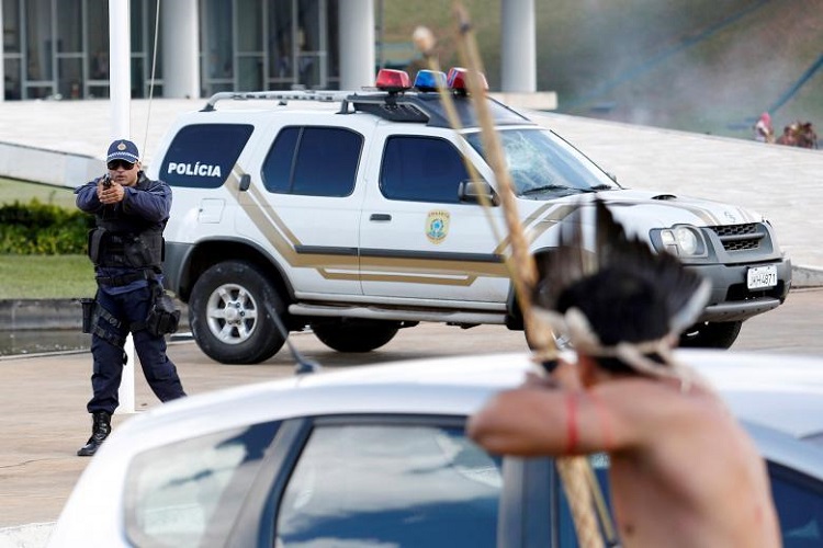 Un oficial de policía apunta a un indio, durante una protesta contra la violación de los derechos de los pueblos indígenas en Brasilia, Brasil, 25 de Abril, 2017