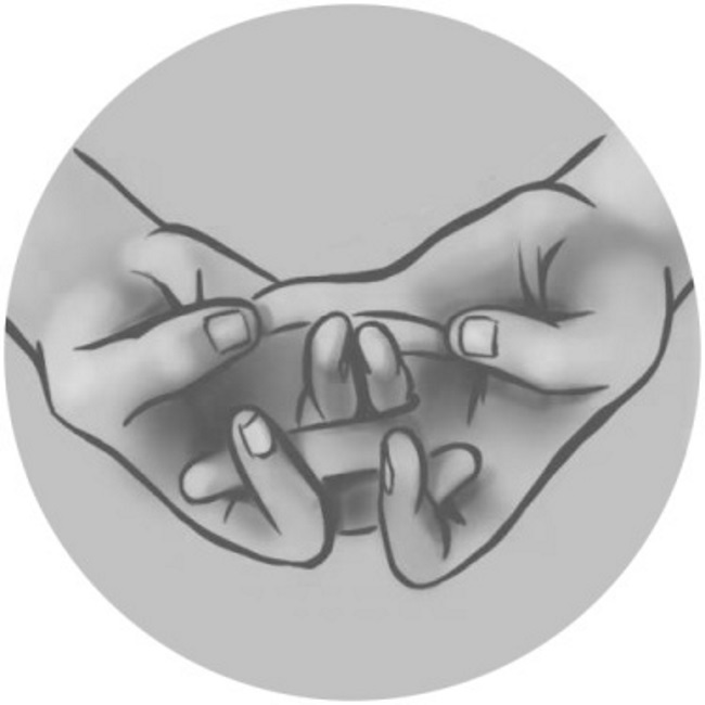 Coloca los dedos medio y anular de la mano derecha sobre los dedos correspondientes de la mano izquierda. Introduce el meñique de la mano izquierda cerca de la base de los dedos medio y anular de la mano derecha, desde la parte posterior de la mano. Luego, fija su posición con el dedo meñique de la mano derecha. Falange terminal del índice de la mano derecha fíjalo entre el pulgar y el índice de la mano izquierda.